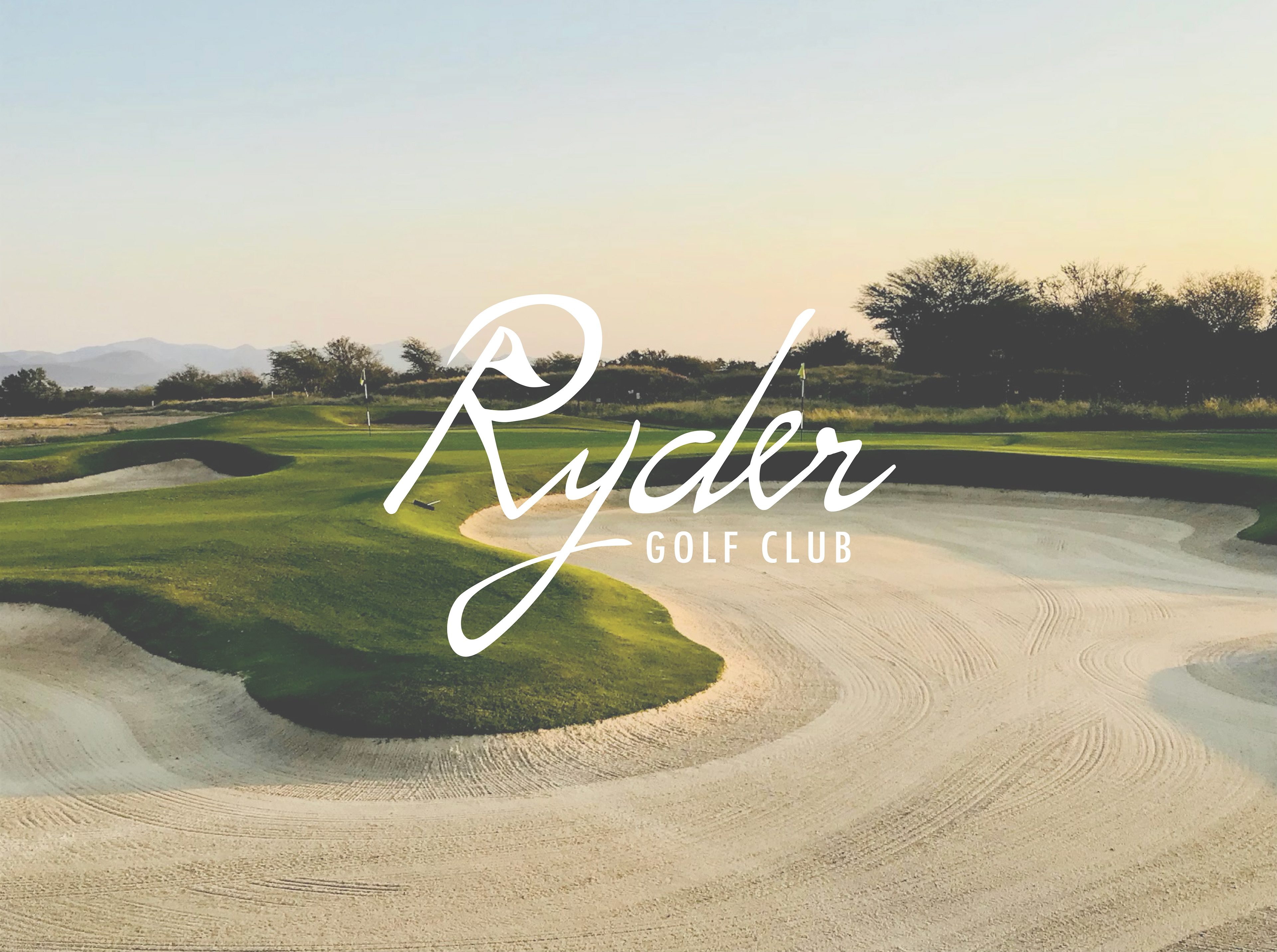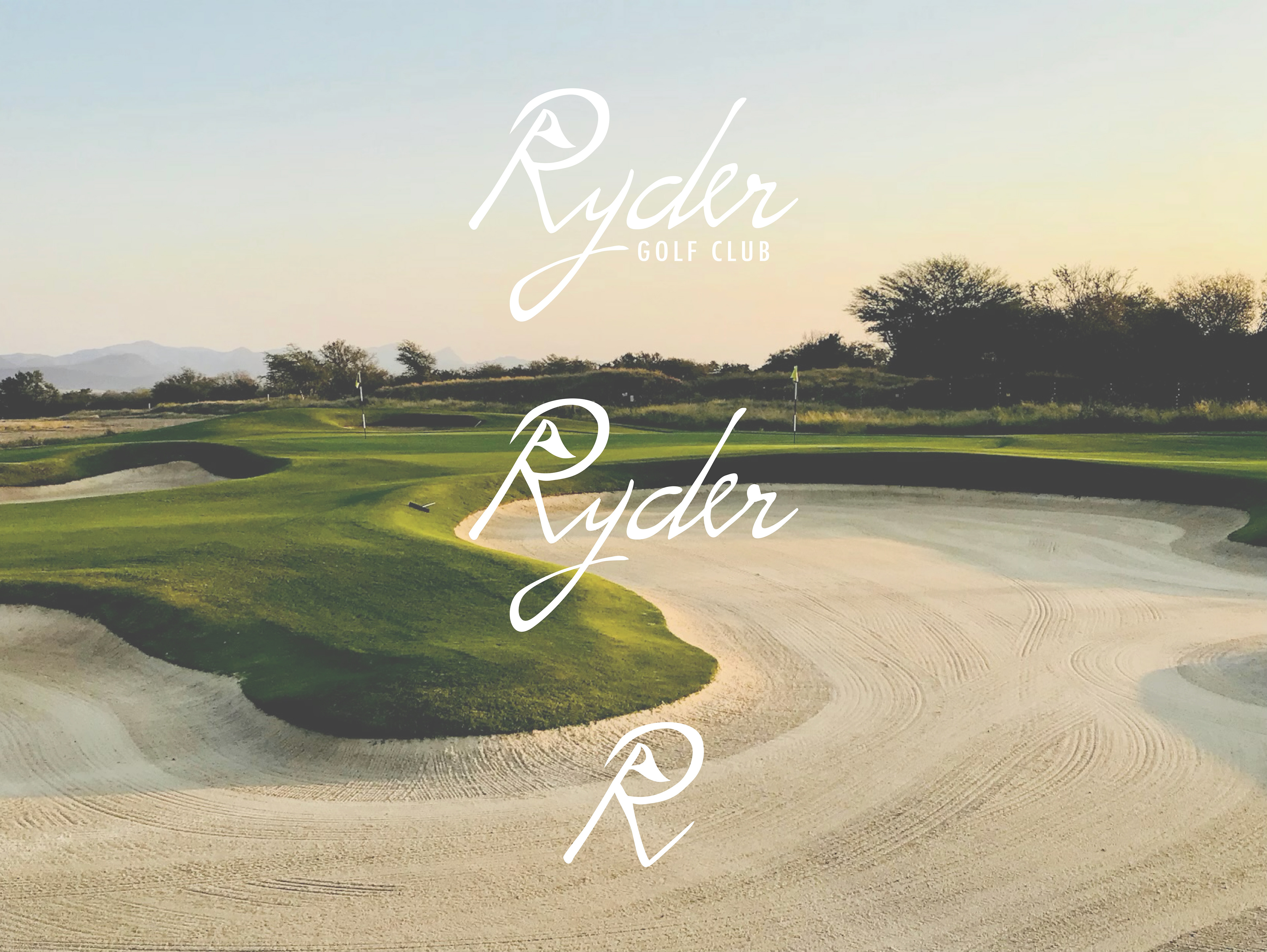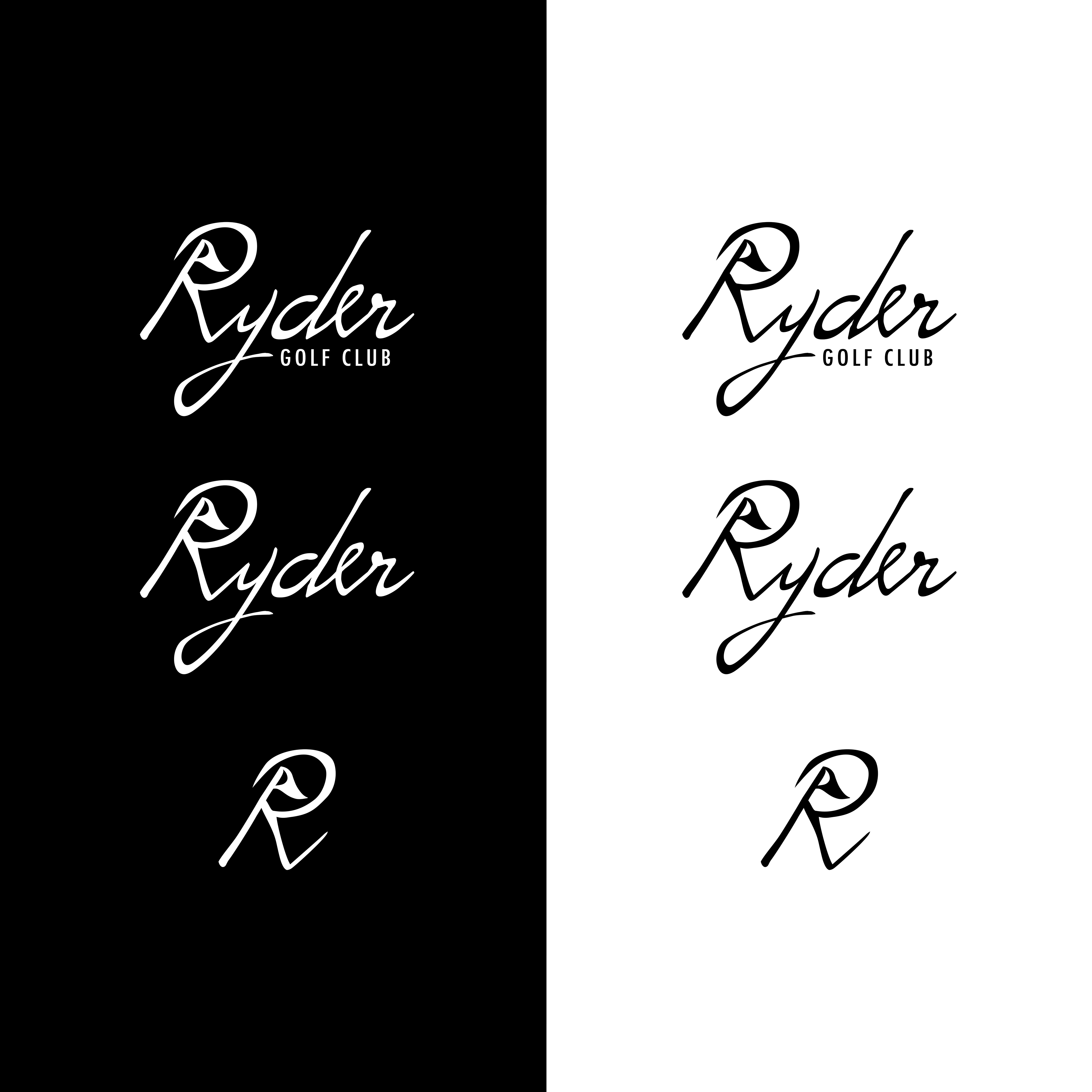The primary logo features “Ryder” in a handwritten style, with the leg of the “R” transformed into a golf flag—subtly tying the typography to the sport. The brand system includes multiple logo variations for versatility across apparel and accessories.