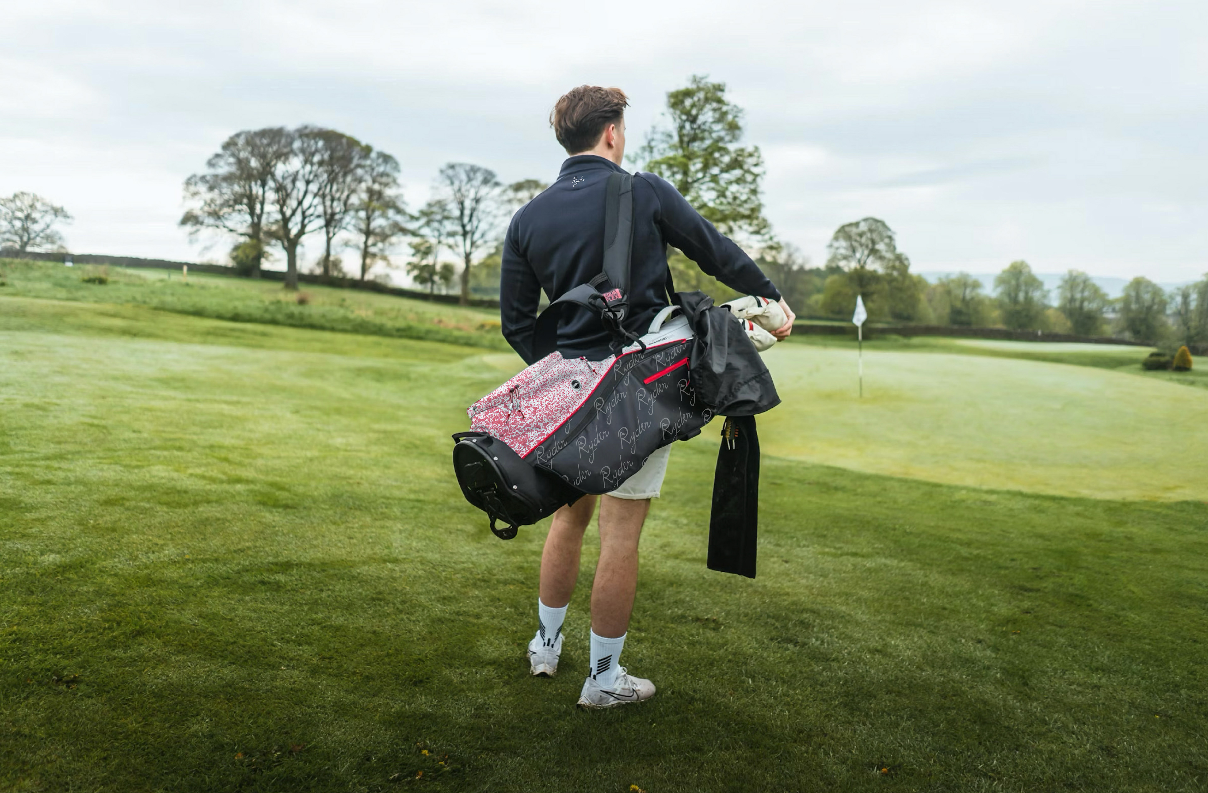 The apparel collection includes an all-over print shirt featuring a repeating golf ball and club pattern, finished with the Ryder logo on the left chest. The hat design incorporates a premium leather circular patch engraved with “Ryder Golf Club,” adding a heritage-inspired touch.